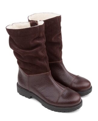 Сапожки демисезонные для девочки на подкладке из шерстяной байки. Выполнены из натуральной коричневой кожи и велюра. Элегантная модель с мягким, комфортным