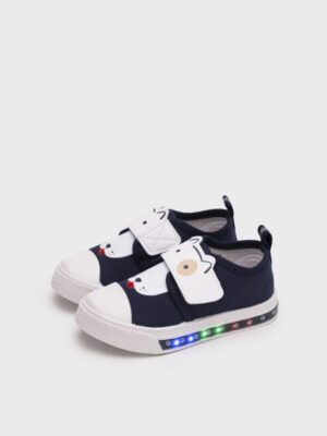 Текстильные детские кеды на подошве с огоньками для мальчика. Для удобства обувания предусмотрена широкая застежка липучка с оригинальной мордочкой собаки.