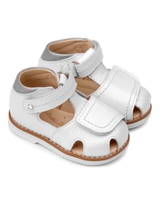 Легкие сандалии с полузакрытым носом на первый шаг для девочки. Выполнены из перламутровой кожи жемчужного цвета. Упругая, умеренно-эластичная подошва