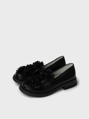 Школьные туфли для девочки подростка с оригинальным оформлением многослойными цветами из сетки. Верх обуви выполнен из искусственной кожи.