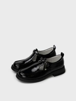 Школьные туфли для девочки подростка из мягкой лаковой кожи. Туфли декорированы пряжкой с подвесом со стразами. Возвратный чересподъемный ремень на липучке