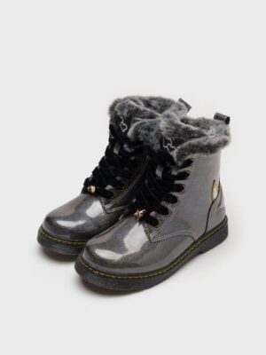 Ботинки детские демисезонные для девочки. Верх обуви выполнен из искусственной лаковой кожи с глитерным эффектом. Отделка искусственным мехом.