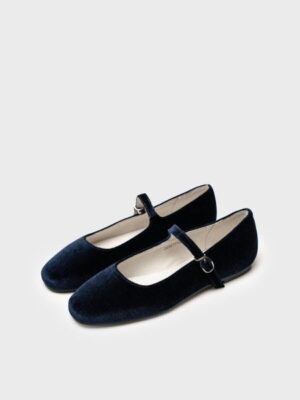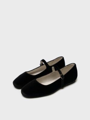 Туфли-балетки для девочки подростка выполнены из бархата. Пряжка на чересподъемном ремне крепится на резинку, поэтому туфли можно обувать не расстегивая ремень.