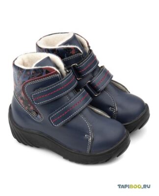 Ботиночки утепленные для мальчиков на подкладке из шерстяной байки. Выполнены из натуральной кожи синего цвета, украшены контрастной строчкой, принтом