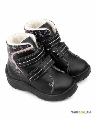 Ботиночки утепленные для девочек на подкладке из шерстяной байки. Выполнены из натуральной кожи чёрного цвета, украшены контрастной строчкой, принтом и