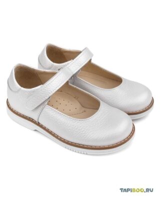 Лаконичная нарядная модель туфелек для девочки на весну и лето для ежедневной профилактики плоскостопия. Выполнены из натуральной кожи белоснежно-перламутрового цвета.