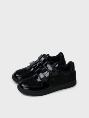 Трендовые кроссовки со стразами для девочки подростка. Верх обуви выполнен из искусственной лаковой кожи и замши со стразами. Модель имеет две застежки
