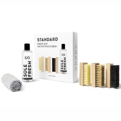 Оптимальный набор для чистки кроссовок. Подходит для чистки обуви из всех материалов, удаляет 98 % загрязнений. В состав набора входит: Чистящее средство «Sole Fresh» (250 мл); Щетка «Classic» для синтетики и кожи; Щетка «Sole» для подошвы; Щетка «Premium» для кожи и замши; Полотенце из микрофибры. Одного флакона чистящего средства хватает на более чем 150 чисток! Инструкция: Смочите подходящую для материала щетку водой Окуните щетку в холодную воду и стряхните впитавшуюся воду. Используйте щетку Classic для синтетики и кожи, щетку Sole для подошвы, щетку Premium для натуральной кожи, замши и нубука. Нанесите 5-7 капель средства на щетку Наше средство хорошо пенится, чрезмерное использование может привести к образованию пятен. Круговыми движениями вспеньте средство на всей поверхности кроссовка 5 минут чистки для одной пары кроссовок со средним усилием при нажиме позволит полностью очистить кроссовки от въевшейся грязи. Будьте аккуратны при чистке замши и нубука, эти материалы нужно чистить с минимальным количеством воды и средства. Удалите пену полотенцем из микрофибры При удалении пены с подошвы можно делать это сильнее, полотенце поможет удалить глубокие загрязнения. Оставьте кроссовки сохнуть при комнатной температуре 24 часа Не используйте батареи, фен и любые нагревательные приборы, тепловое воздействие может повредить обувь.