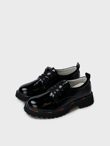 Полуботинки из искусственной лаковой кожи для девочки подростка. Полуботинки имеют цветной рант и в тон ему цветные шнурки. Но если вы хотите сменить образ, то в комплекте есть простые черные шнурки. Подкладка и стелька — 100% натуральная кожа. Подошва из ТПР не скользит и устойчива к истиранию. Высота каблука 3,5 см — очень комфортная для повседневной носки. Формоустойчивый задник поддерживает стопу в правильном положении. Эргономичная форма колодки обеспечивает правильное формирование стопы ребенка. Туфли для девочки школьницы отлично подойдут как сменка в школу, а также для прогулок: весна, лето, ранняя осень.