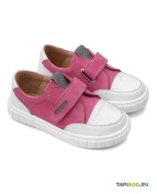 Полуботиночки в спортивном стиле для маленьких девочек. Выполнены из мягкого натурального нубука яркого малинового цвета и натуральной белой кожи. Модная, упругая, гибкая подошва. Нежная многослойная стелька из яловой кожи (кожа теленка) с мягким сводоподдерживающим элементом. Застежка на ремешок с липучкой для лучшего регулирования по полноте. Модель хорошо раскрывается для комфортного надевания. На ремешке и язычке — декоративные элементы из светоотражающего материала.