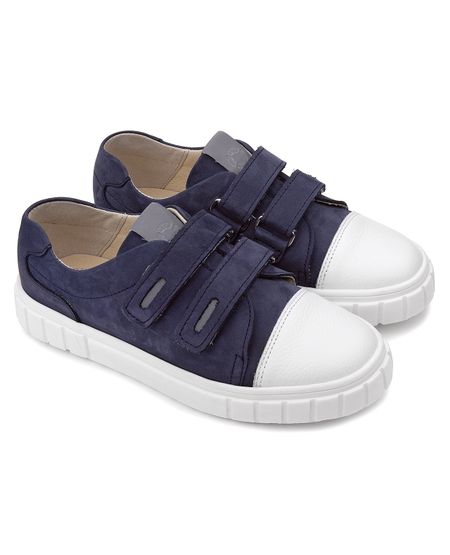 Модные и комфортные полуботинки в спортивном стиле для мальчиков. Выполнены из натурального мягкого синего нубука и белой кожи. Современная, устойчивая, упругая и гибкая подошва. Нежная многослойная кожаная стелька с мягким сводоподдерживающим элементом. Задник средней жесткости. Два ремешка с липучками позволят подогнать кеды по полноте. Украшены светоотражающим логотипом на язычке.