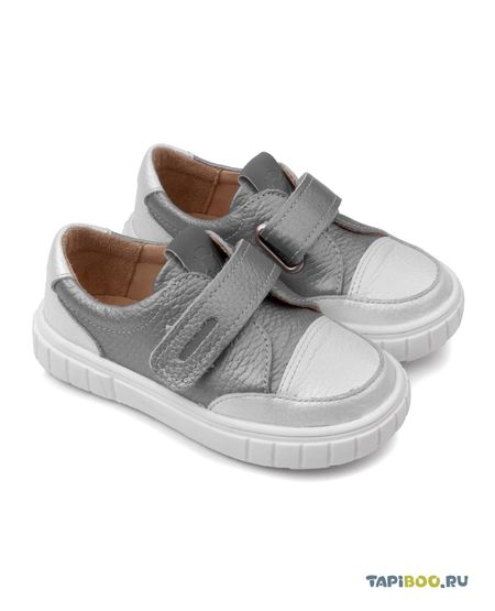 Полуботиночки в спортивном стиле для самых маленьких девочек. Выполнены из мягкой натуральной кожи — белой перламутровой и серебристой. Модная, упругая, гибкая подошва. Нежная многослойная стелька из яловой кожи (кожа теленка) с мягким сводоподдерживающим элементом. Застежка на ремешок с липучкой для лучшего регулирования по полноте. Модель хорошо раскрывается для комфортного надевания. На ремешке и язычке — декоративные элементы из светоотражающего материала.