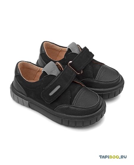 Полуботиночки в спортивном стиле для самых маленьких. Выполнены из мягкого натурального нубука и натуральной кожи универсального черного цвета. Модная, упругая, гибкая подошва. Нежная многослойная стелька из яловой кожи (кожа теленка) с мягким сводоподдерживающим элементом. Застежка на ремешок с липучкой для лучшего регулирования по полноте. Модель хорошо раскрывается для комфортного надевания. На ремешке и язычке — декоративные элементы из светоотражающего материала.