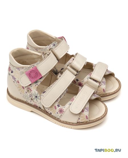 Классические сандалии для ежедневной профилактики плоскостопия для девочек. Выполнены из гладкой кожи светло-бежевого цвета с летним цветочным принтом. Застежка на три ремешка с липучками для наилучшей фиксации ножки ребенка. Широкий, устойчивый каблук, специальной конфигурации — каблук Томаса. Каблук продлен с внутренней стороны до середины стопы, чтобы исключить вращение (заваливание) стопы вовнутрь. Многослойная, анатомическая стелька со сводоподдерживающим элементом для правильного формирования стопы. Использование современных внутренних материалов позволяет оптимально распределить нагрузку по всей площади стопы и свести к минимуму ее ударную составляющую. Жесткий фиксирующий задник надежно стабилизирует голеностопный сустав во время ходьбы, препятствуя развитию патологических изменений стопы. Упругая, умеренно-эластичная подошва, имеющая перекат, позволяет повторить естественное движение стопы при ходьбе для правильного распределения нагрузки на опорно-двигательный аппарат. Нежная подкладка из яловой кожи (кожа теленка).
