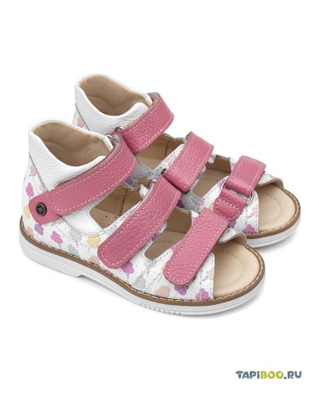 Классические сандалии с открытым носом на трёх липучках для девочек. Выполнены из натуральной кожи розового и белого цвета с красочным принтом. Для ежедневной профилактики плоскостопия. Застежка на три ремешка с липучками для наилучшей фиксации ножки ребенка. Широкий, устойчивый каблук, специальной конфигурации — каблук Томаса. Каблук продлен с внутренней стороны до середины стопы, чтобы исключить вращение (заваливание) стопы вовнутрь. Многослойная, анатомическая стелька из яловой кожи со сводоподдерживающим элементом для правильного формирования стопы. Использование современных внутренних материалов позволяет оптимально распределить нагрузку по всей площади стопы и свести к минимуму ее ударную составляющую. Жесткий фиксирующий задник. Упругая, умеренно-эластичная подошва, имеющая перекат, позволяет повторить естественное движение стопы при ходьбе, для правильного распределения нагрузки на опорно-двигательный аппарат ребенка. Нежнейшая подкладка из яловой кожи (кожа теленка).