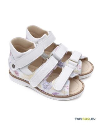 Нежные сандалии с открытым носом для девочки для ежедневной профилактики плоскостопия. Выполнены из натуральной белой кожи с деликатным "акварельным" принтом. Широкий, устойчивый каблук специальной конфигурации — каблук Томаса. Многослойная, анатомическая стелька со сводоподдерживающим элементом для правильного формирования стопы. Жесткий фиксирующий задник с удлиненным крылом надежно стабилизирует голеностопный сустав во время ходьбы. Упругая, умеренно-эластичная подошва, имеющая перекат, позволяющий повторить естественное движение стопы при ходьбе для правильного распределения нагрузки на опорно-двигательный аппарат ребенка. Застежка на три липучки для регулирования по полноте и наилучше фиксации ножки. Подкладка из натуральной кожи. Сандалии украшены серебристым логотипом.