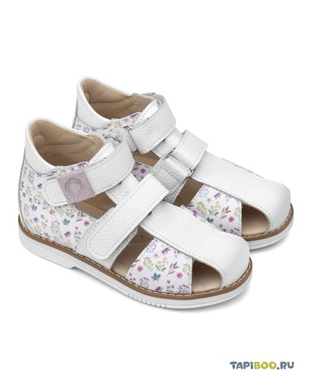Классические сандалии для девочек с полузакрытым носом для ежедневной профилактики плоскостопия. Выполнены из белой натуральной кожи с нежным цветочным принтом. Застежка на два ремешка с липучками для наилучшей фиксации ножки ребенка. Широкий, устойчивый каблук, специальной конфигурации — каблук Томаса. Каблук продлен с внутренней стороны до середины стопы, чтобы исключить вращение (заваливание) стопы вовнутрь. Многослойная, кожаная, анатомическая стелька со сводоподдерживающим элементом для правильного формирования стопы. Жесткий фиксирующий задник надежно стабилизирует голеностопный сустав во время ходьбы, препятствуя развитию патологических изменений стопы. Упругая, умеренно-эластичная подошва, имеющая перекат, позволяет повторить естественное движение стопы при ходьбе для правильного распределения нагрузки на опорно-двигательный аппарат ребенка. Подкладка из нежной яловой кожи (кожа теленка).