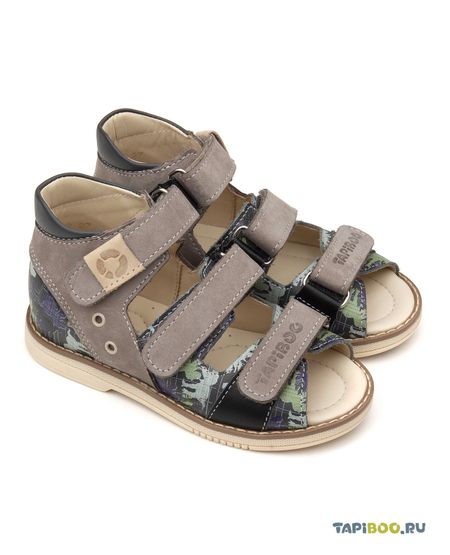 Сандалии для мальчиков для ежедневной профилактики плоскостопия. Изготовлены из натурального нубука благородного, серо-бежевого, тёплого цвета и натуральной серой кожи с принтом. Широкий, устойчивый каблук, специальной конфигурации — каблук Томаса. Каблук продлен с внутренней стороны до середины стопы, чтобы исключить вращение (заваливание) стопы вовнутрь. Многослойная, анатомическая стелька с подсводником для правильного формирования стопы. Использование современных внутренних материалов позволяет оптимально распределить нагрузку по всей площади стопы и свести к минимуму ее ударную составляющую. Жесткий фиксирующий задник надежно стабилизирует голеностопный сустав во время ходьбы. Упругая, умеренно-эластичная подошва, имеющая перекат, позволяет повторить естественное движение стопы при ходьбе для правильного распределения нагрузки на опорно-двигательный аппарат. Три ремешка с липучками для наилучшей фиксации стопы и регулировки по полноте. Нежная подкладка из яловой кожи (кожа теленка).