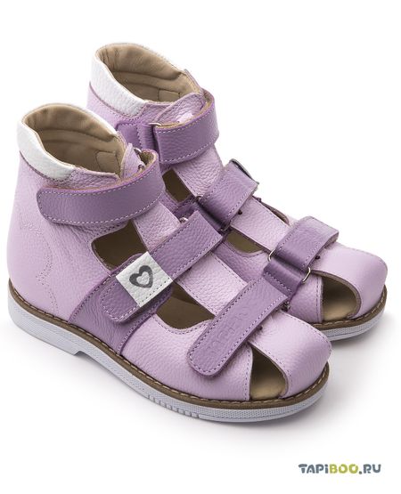 Эти ортопедические сандалии с полузакрытым носом разработаны для коррекции стоп при вальгусной деформации, а также для профилактики плоскостопия. Применение данной модели рекомендовано детям при наличии сформировавшихся деформаций. Жесткий фиксирующий задник увеличенной высоты и возможность регулировки полноты тремя застежками велкро обеспечивают необходимую фиксацию голеностопа в правильном положении. При применении данной обуви необходимо использование индивидуальных ортопедических стелек по назначению врача-ортопеда. . Широкий, устойчивый каблук, специальной конфигурации — каблук Томаса. Подкладка из кожи теленка без швов. Кожа теленка обладает повышенной износостойкостью в сочетании с мягкостью и отличной способностью пропускать воздух для создания оптимального температурного режима (нога не потеет). Сандалии изготовлены из гладкой кожи нежных сиреневых оттенков.