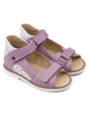Очень летние, модные сандалии с открытым носом для ежедневной профилактики плоскостопия. Выполнены из натуральной кожи сиреневого и белого цвета в сочетании с нежным принтом. Застежка на два ремешка с липучками для наилучшей фиксации ножки ребенка. Широкий, устойчивый каблук, специальной конфигурации — каблук Томаса. Многослойная, анатомическая стелька со сводоподдерживающим элементом для правильного формирования стопы. Благодаря использованию современных внутренних материалов позволяет оптимально распределить нагрузку по всей площади стопы и свести к минимуму ее ударную составляющую. Жесткий фиксирующий задник. Упругая, умеренно-эластичная подошва, имеющая перекат, позволяющий повторить естественное движение стопы при ходьбе для правильного распределения нагрузки на опорно-двигательный аппарат ребенка. Нежная подкладка из яловой кожи. Сандалии украшены металлическим логотипом.
