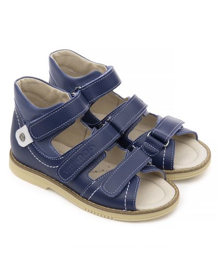 Классические сандалии для мальчика из натуральной гладкой кожи универсального синего цвета, украшены серебристым логотипом. Для ежедневной профилактики плоскостопия. Широкий, устойчивый каблук специальной конфигурации — каблук Томаса. Многослойная, анатомическая стелька со сводоподдерживающим элементом для правильного формирования стопы. Жесткий фиксирующий задник с удлиненным крылом надежно стабилизирует голеностопный сустав во время ходьбы. Упругая, умеренно-эластичная подошва, имеющая перекат, позволяющий повторить естественное движение стопы при ходьбе для правильного распределения нагрузки на опорно-двигательный аппарат ребенка. Подкладка из натуральной кожи.