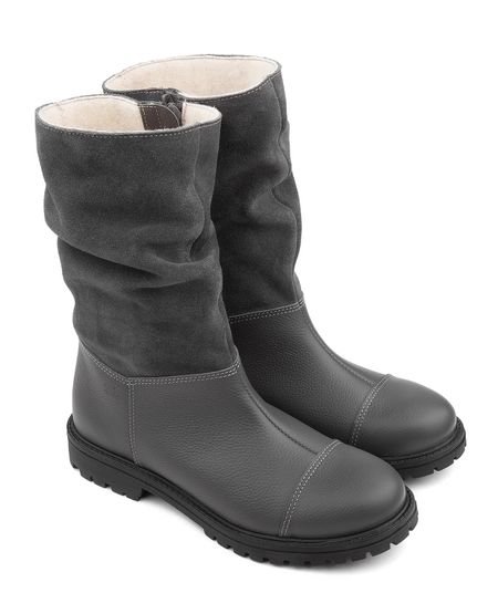 Сапожки демисезонные для девочки на подкладке из шерстяной байки. Выполнены из натуральной серой кожи и велюра. Элегантная модель с мягким, комфортным, присборенным голенищем. Упругая анатомическая стелька для правильного формирования стопы. Жесткий фиксирующий задник надежно стабилизирует голеностопный сустав во время ходьбы. Упругая, умеренно-эластичная подошва с протектором, имеющая перекат, позволяет повторить естественное движение стопы при ходьбе для правильного распределения нагрузки на опорно-двигательный аппарат ребенка. Подкладка из шерстяной байки поддерживает комфортную температуру внутри обуви при погодных условиях примерно от +5 до -5-7 градусов. Для дополнительного удобства сапожки снабжены застежкой-молнией, что позволяет легко снимать и надевать обувь.