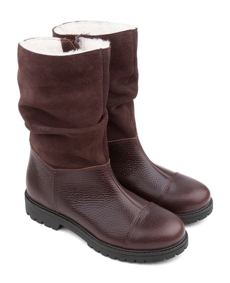 Сапожки утепленные для девочки на подкладке из шерстяного меха (овечий "чёс" на трикотажной основе). Выполнены из натуральной коричневой кожи и велюра. Элегантная модель с мягким, комфортным, присборенным голенищем. Упругая анатомическая стелька для правильного формирования стопы. Жесткий фиксирующий задник надежно стабилизирует голеностопный сустав во время ходьбы. Упругая, умеренно-эластичная подошва с протектором, имеющая перекат, позволяет повторить естественное движение стопы при ходьбе для правильного распределения нагрузки на опорно-двигательный аппарат ребенка. Подкладка из шерстяного меха поддерживает комфортную температуру внутри обуви при погодных условиях от -5 до -15 градусов. Для дополнительного удобства сапожки снабжены застежкой-молнией, что позволяет легко снимать и надевать обувь.
