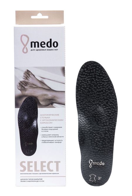 Анатомические каркасные стельки medo SELECT BLACK для уменьшения усталости ног и профилактики плоскостопия делают использование любимой пары обуви еще более комфортным и приятным. Подходят для замены старой съемной стельки или для установки в свободную обувь поверх имеющейся стельки. Для закрытой обуви.