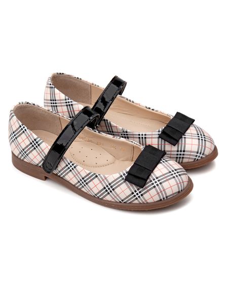 Изысканные классические туфельки с элегантным ремешком на липучке и бантом из тесьмы. Идеально подходят как к нарядному платью, так и для школы. Выполнены из гладкой бежевой кожи с утончённым принтом "клетка", украшены лаковым черным ремешком и нарядным бантом из чёрной широкой тесьмы. Упругая подошва с естественным перекатом не оставляет следов на полу и не скользит. Подкладка из нежнейшей кожи теленка. Многослойная стелька с выкладкой свода стопы.