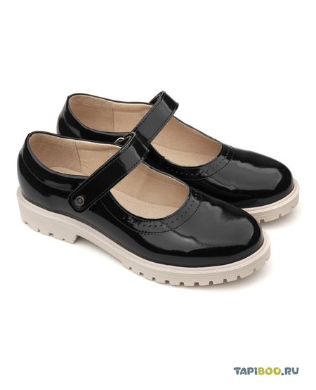 Нарядные лаковые классические туфельки для девочки. Выполнены из натуральной лаковой кожи чёрного цвета. Гибкая, светлая, современная подошва с протектором — не оставляет следов и не скользит, а также позволяет повторить естественное движение стопы при ходьбе для правильного распределения нагрузки на опорно-двигательный аппарат ребенка. Подкладка из натуральной кожи и многослойная кожаная анатомическая стелька со сводоподдерживающим элементом для правильного формирования стопы. Элегантный ремешок с липучкой для наилучшей регулировки по полноте. Использование современных внутренних материалов позволяет оптимально распределить нагрузку по всей площади стопы и свести к минимуму ее ударную составляющую. Жесткий задник надежно стабилизирует голеностопный сустав во время ходьбы, препятствуя развитию патологических изменений стопы. Туфли украшены декоративной строчкой с перфорацией в носочной части и металлическим логотипом на ремешке.