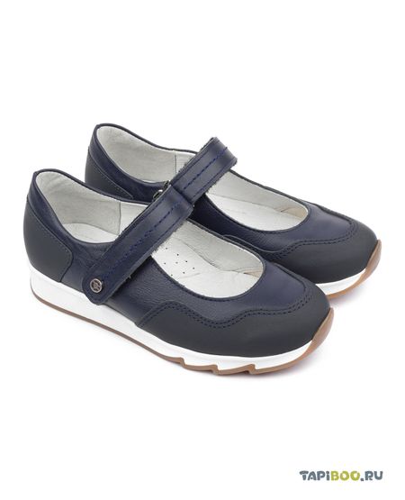 Модный спортивный вариант классических туфелек для девочки. Выполнены из натуральной кожи синего цвета, кожа с гидрофобным покрытием на носке и пятке. Современная упругая подошва, жесткий задник, многослойная анатомическая стелька с выкладкой свода стопы. Ремешок с липучкой для наилучшей фиксации по ножке ребенка. Украшены металлическим логотипом.