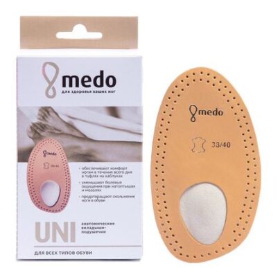 Анатомические вкладыши-подушечки medo Uni амортизируют и уменьшают болевые ощущения при натоптышах в переднем отделе стопы. Подходят для закрытой обуви и обуви с открытой пяточной частью.