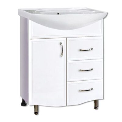 Корпус: ЛДСП Цвет: белый Фасад: МДФв пленке ПВХ Три выдвижных ящика справа Вкладная полка из ЛДСП слева Комплектация: доводчики, ручки, ножки Раковина
