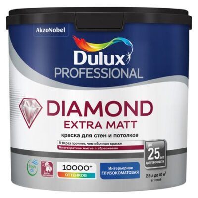 краска в/д DULUX Trade Diamond Extra matt база BС для стен и потолков 2,25л бесцветная, арт.5273958
