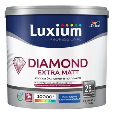 DULUX Trade Diamond Extra matt Объем: 2,5 л Тип основы: акриловая Тип помещения: сухое Назначение: для стен и потолков Цвет: белый Дополнительно: может колероваться Степень блеска: глубокоматовый Влагостойкость краски: нет Расход материала: 0,15л/кв.м