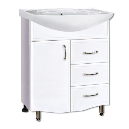 Корпус: ЛДСП Цвет: белый Фасад: МДФв пленке ПВХ Три выдвижных ящика справа Вкладная полка из ЛДСП слева Комплектация: доводчики, ручки, ножки Раковина в комплекте