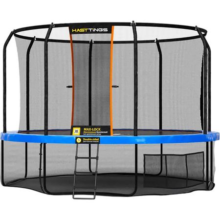 Основные характеристики- Тип: любительский — Форма: круглая — Диаметр прыжковой зоны: 336 см — Внешний диаметр: 396 см — Максимальная нагрузка: 160 кг — Материал прыжкового полотна: перматрон — Материал рамы: гальванизированная сталь — Материал опор: гальванизированная сталь — Защитная сетка: да — Лестница: да — Защитный мат: да — Цвет: зеленый, синий Конструкция- Крепление рамы: T-образное — Соединение с рамой: пружины — Рама: двойная оцинковка, порошковое окрашивание — Количество пружин: 80 — Тип пружин: бочкообразные пружины — Количество верхних стоек: 8 — Количество опор основания: 4 — Тип опор основания: W-образные — Высота опор: 90 см Защитная сетка- Размещение сетки: внутреннее — Kрепление сетки: Max-lock — Высота защитной сетки: 180 см — Материал защитной сетки: полиэтилен — Тип застёжки сетки: клапан — Защита от нежелательного открывания: да — Нижняя защитная сетка: да Защитный мат- Материал защитного мата: поливинилхлорид Лестница- Крепление лестницы: съёмное — Количество ступенек лестницы: 2 Дополнительные характеристики- Антикоррозийное покрытие: да — Повышенная износостойкость полотна: да — Устойчивая конструкция: да — Безопасный вход: да — Внешний карман: да — Дополнительная информация: возможность использовать две стороны мата, тип крепления верхних стоек к раме батута — фиксатор Pop-Pin Комплектация- Фиксаторы батута: да — Дополнительная комплектация: ключ для установки пружин, набор инструментов и крепежей — Инструкция: да Размеры и вес- Высота: 260 см — Ширина: 396 см — Глубина: 396 см — Вес: 86.5 кг