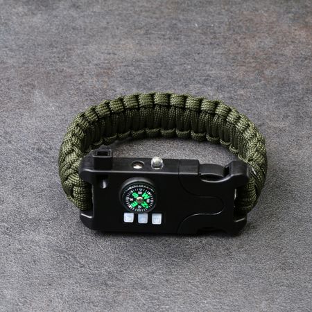 Браслет для выживания 5в1 (паракорд — 3 м, компас, свисток, огниво, фонарь), цвет олива. <b> Браслет из паракорда</b> представляет собой веревку, сплетенную в компактный аксессуар. При необходимости ремень можно размотать за 30 секунд и использовать в качестве троса, жгута или ловушки.