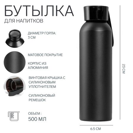 Бутылка для воды, 500 мл, 6.5×23 см, корпус из алюминия. Бутылка для воды — это идеальный аксессуар для всех любителей спорта и фитнеса. С компактными размерами 6.5 х 23 см, она отлично впишется в любой рюкзак или сумку, позволяя вам поддерживать водный баланс в течение всего дня. Диаметр горла бутылки составляет 3 см. Корпус из алюминия не только добавляет ей современного вида, но и обеспечивает легкость и прочность, что делает эту бутылку идеальным выбором для путешествий, спортивных мероприятий или просто для повседневного использования. Используйте бутылку для питья воды, соков или для любых других напитков после физической нагрузки. <b> Рекомендации</b> <ul> <li> Не мойте изделие в посудомоечной машине</li> <li> Плотно закрывайте крышку</li> <li> Не наливайте жидкость с температурой выше 55 °C и не замораживайте бутылку</li> </ul>
