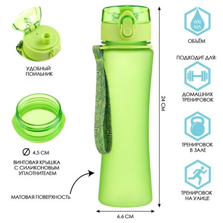 Бутылка для воды, с поильником, 600 мл, зеленая. Спортивная бутылка для воды идеально подойдет для всех, кто ведет активный образ жизни. Это стильный аксессуар, который не только позволит вам утолить жажду, но и станет незаменимым атрибутом для занятий спортом, туризма и пеших прогулок. С этой спортивной бутылкой вы всегда будете иметь возможность поддерживать свой организм правильным уровнем водного баланса. Она станет вашим верным спутником как на тренировках, так и в повседневной жизни. Благодаря ее удобной форме и вместительности в 600 мл, она легко помещается в сумке или рюкзаке. Эта бутылочка для воды идеальна для использования в школе и на спортивных занятиях детей и малышей. Она изготовлена из прочного и экологически чистого пластика, который не повреждается при активном использовании и позволяет сохранять воду свежей и чистой на протяжении всего дня. Бутылка оборудована герметичной крышкой с поильником и удобным ремешком, который позволяет носить ее с собой или крепить к сумке или рюкзаку. Подарите эту бутылку маме, бабушке, папе, другу, подруге, сестре на любой праздник – она станет полезным и практичным подарком для здорового образа жизни!
