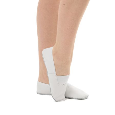 Чешки комбинированные, р. 22,5, длина стопы 15 см, цвет белый. Чешки подходят для занятий танцами, гимнастикой и спортом. Подошва из натуральной кожи не скользит на гладком паркете и обеспечивает хорошее сцепление с площадкой. Широкая мягкая резинка крепко удерживает стопу, с ней чешки плотно сидят на ноге. Нейтральный цвет подойдет любому костюму.
