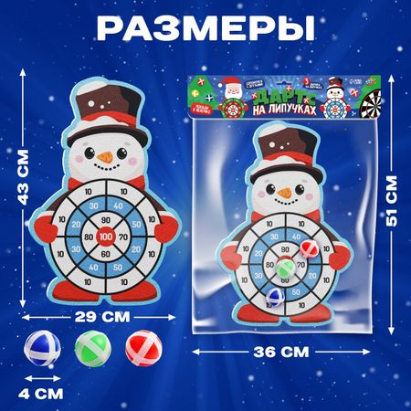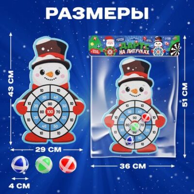 Дартс на липучках «Снеговичок». Дартс на липучках «Снеговичок» — это веселая и безопасная игра, которая отлично подходит для детей от 3 лет. Ребенок вместе с друзьями сможет потренироваться в меткости и увлекательно провести время. Эта игра не только развлечет маленького непоседу, но и поспособствует развитию важных навыков. <b> Особенности и преимущества</b> <ul> <li> В комплекте есть 3 шарика на липучках.</li> <li> Игрушки сделаны из текстиля и высококачественного нетоксичного пластика, это делает игровой набор безопасным для детей.</li> <li> Дартс на липучках не имеет острых углов, поэтому не сможет причинить вред ребенку.</li> <li> Набор имеет компактный размер и прост в установке, что позволяет играть в дартс дома и на улице.</li> </ul> <b> Играем с пользой</b> Дартс на липучках «Снеговичок» не только подарит радость от увлекательных игр, но и поможет в развитии важных навыков. Набор поможет ребенку улучшить мелкую моторику рук, развить координацию движений и концентрацию внимания, а также скорость реакции.