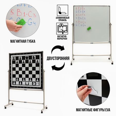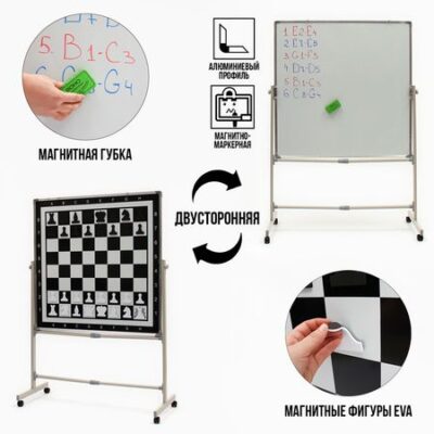 Двусторонняя доска размером 1 x 1 м представляет собой уникальное и многофункциональное решение для проведения различных мероприятий, требующих использование доски. Она выполнена в виде мобильного стенда, который позволяет легко поворачивать и фиксировать доску в нужном положении.Одна сторона доски является шахматной, что делает ее идеальным выбором для обучающих мероприятий, турниров, для разбора ошибок и стратегий после или перед интеллектуальными соревнованиями. Вторая сторона доски магнитно-маркерная. Магнитные свойства поверхности позволяют использовать изделие в качестве мольберта или крепить наглядные материалы и обучающие карточки на разнообразные магниты. Маркерное покрытие обеспечивает возможность нанесения записей с помощью специальных маркеров, которые легко стираются губкой и не оставляют следов после себя.Магнитно-маркерная доска 100 х 100 см в металлической рамке из алюминия на мобильной подставке позволяет представить аудитории значительно большее количество данных, чем стандартные модели, закрепляемые на стене. Крепление к раме вращается на 360 градусов.Доска отлично подходит для работы в группах в условиях размещения за индивидуальными столами и партами большого количества человек во время презентаций проектов перед коллегами, школьниками, студентами, для демонстрационных игр в шахматы или шашки, для тренировок интеллектуальных спортсменов.