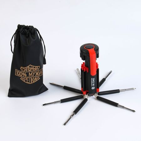 Многофункциональный фонарь “100% Мужик” — это не просто фонарь, это мультитул с 8 различными функциями. Он станет незаменимым помощником для любителей активного отдыха на природе, туристов и путешественников. Благодаря компактным размерам и легкому весу, его удобно брать с собой в поход, путешествие или на прогулку. Многофункциональный набор отверток с фонариком 8 в 1 — полезный карманный инструмент для мужчин. Комплект включает в себя 7 отверток и фонарь. Работает от батарейки типа ААА (не идет в комплекте). Авто любителей ручной инструмент выручит в случае непредвиденной поломки машины. Набор мелких отверток поможет устранить поломки, а яркий фонарь обеспечит подсветку автомобиля в темное время суток. Универсальные отвертки помогут при ремонте дома, ремонтных работах на улице, их можно использовать как карманный слесарный инструмент, для рабочего электрика, монтажника и представителей прочих специальностей. Профессиональные строительные принадлежности помогут отремонтировать бытовую технику, электронику, собрать иил отремонтировать мебель. Мини мультитул не займет много места при хранении и перевозке, отверточки компактно складываются в специальный мешочек. Набор инструментов легко поместится в любой походный рюкзак, мужскую сумку, бардачок машины и даже в карман. Потяните оранжевую ручку по стрелке вверх, чтобы открыть отсек для батареек. Поместите элемент питания внутрь, соблюдая полярность. Возможно, потребуется приложить усилие, так как конструкция предполагает плотное расположение деталей для большей надёжности и увеличения срока эксплуатации. “100% Мужик” — надежный и функциональный инструмент, который не подведет в любой ситуации, станет незаменимым помощником в саду, на даче, во дворе, гараже, в беседках и верандах. Компактный мультитул с фонарем полезный и функциональный подарок на праздник брату, папе, дедушке, в день рождения, на 23 февраля, новый год или без повода.