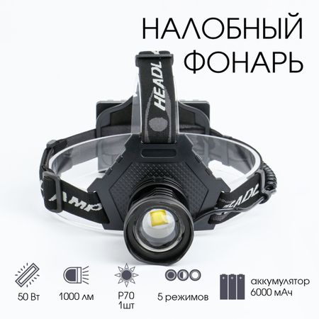 Фонарь налобный аккумуляторный, 50 Вт, 1000 лм, 6000 мАч, LED P70, 5 режимов, от USB. <b> Особенности:</b> <ul> <li> Тип фонаря: Налобный</li> <li> Мощность: 50 Вт</li> <li> Световой поток: 1000 лм</li> <li> Дальность луча: 250 м</li> <li> Количество режимов: 5</li> <li> Тип светодиода: P70</li> <li> Тип питания: аккумулятор 18650 (3 шт)</li> <li> Время автономной работы: 7 часов</li> <li> Ёмкость аккумулятора: 6000 мАч</li> <li> Напряжение: 3.7 В</li> <li> Время заряда аккумулятора: 4 часа</li> <li> Индикатор заряда: да</li> <li> Материал корпуса: пластик, металл</li> <li> Влагозащита: IPX6</li> <li> Гарантия: 3 месяца</li> <li> Комплектация: кабель USB-Micro USB</li> <li> Разъем зарядного устройства: Micro USB</li> <li> Имеется zoom</li> </ul>