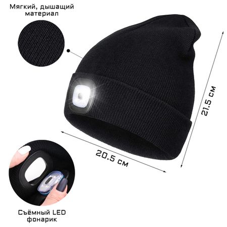 Фонарь-шапка аккумуляторный, 200 мАч, 4 LED, 3 режима, USB. <b> Теплая шапка с LED-фонариком для активного отдыха</b> Теплая и удобная шапка оснащена съемными четырьмя LED — фонариками, что делает ее идеальным выбором для активного отдыха в условиях низкой освещенности. Благодаря этому аксессуару вы можете выполнять любые задачи даже в полной темноте, оставаясь при этом хорошо заметными на улицах и дорогах. <b> Основные особенности:</b> <ul> <li> Материал: Акрил, обеспечивающий тепло и комфорт.</li> <li> Съемный фонарик: Легко отсоединяется для удобства стирки и хранения.</li> <li> Режимы свечения: Фонарик предлагает 3 различных режима работы: 100% яркости, 75% яркости и мигающий режим.</li> <li> Яркость свечения: До 80 люменов, что позволяет обеспечить хорошее освещение в темноте.</li> <li> Автономная работа: Время непрерывного свечения достигает 3 часов.</li> <li> Зарядка: Фонарь заряжается через USB-порт всего за 2 часа.</li> </ul> <b> Рекомендации по уходу:</b> Перед стиркой обязательно снимайте фонарик. <b> Универсальность:</b> Шапка подходит как взрослым, так и детям благодаря регулируемому размеру. Максимальный диаметр может достигать 40 см, в зависимости от обхвата головы. Размер в ненатянутом состоянии составляет 20,5 см.