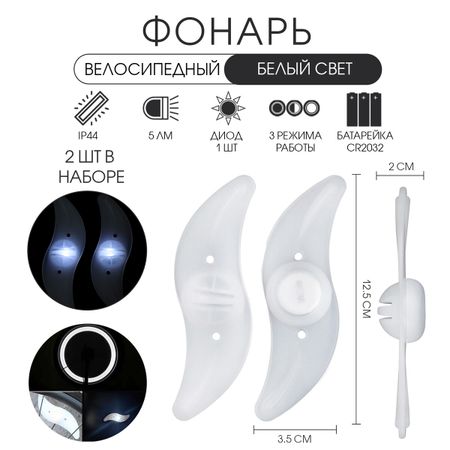 Фонарь велосипедный на спицу, водонепроницаемый, 1 диод, 12.5×3.5×2 см, 2 шт., белый. Велосипедный фонарь предназначен для крепления на спицу колеса. Во время движения велосипеда создает яркий красочный круг внутри колеса, что делает велосипед заметнее на дороге в темное время суток. При использовании нескольких таких катафотов одновременно круг будет ярче.Корпус изготовлен из водонепроницаемого материала, что позволит ездить в дождь и по неглубоким лужам.Легко крепится на спицу колеса. Для крепления не нужны специальные инструменты: у подсветки есть прорезь, в которой фиксируется спица, по бокам фонарь зажат соседними спицами. <b> Особенности:</b> <ul> <li> Световой поток: 5 Лм</li> <li> Одноцветный, белый</li> <li> Легко устанавливается на спицу велосипеда (самоката)</li> <li> 3 режима работы: мигание, мерцание и яркая вспышка</li> <li> Степень защиты: IP44</li> <li> Световой поток: 5 Лм</li> <li> Работает от батарейки CR2032 (входит в комплект)</li> </ul>