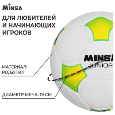 Футбольный мяч MINSA Junior, ручная сшивка, 32 панели, р. 4, PU. Мяч Minsa Junior разработан для тренировок и игр детей возрастом до 10–12 лет. Изготовлен из глянцевого полиуретана с 3 подкладочными слоями и бутиловой камерой с бутиловым ниппелем. Мяч сшит вручную из 32 панелей. Бутиловая камера практически не пропускает воздух, это позволяет длительное время сохранять заданное давление в мяче без частого подкачивания. Мяч имеет стандартный размер — 4, длина окружности составляет 63,5–66 см, вес — 310–330 г. Такая конструкция облегчает тренировки и способствует выработке правильных игровых навыков. Подходит для игры на любых поверхностях и при любых погодных условиях (при соблюдении условий эксплуатации и ухода). В комплект входит игла для накачивания, инструкция по эксплуатации и уходу за мячом. Характеристики <ul> <li> Материал покрышки: полиуретан</li> <li> Материал камеры: бутил</li> <li> Количество панелей: 32</li> <li> Тип соединения: ручная сшивка</li> <li> Размер мяча: 4</li> <li> Уровень: тренировочный</li> </ul>