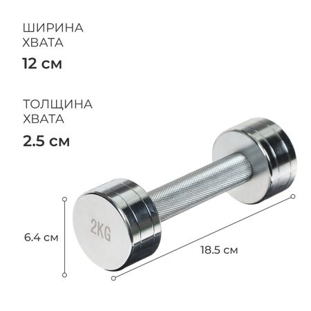 Гантель хромированная ONLYTOP, 2 кг. Гантель подходит для тренировок в спортивном зале и дома. Рифленая ручка не проскальзывает во время захвата. Характеристики <ul> <li> Вес: 2 кг</li> <li> Материал: метал</li> <li> Габариты: 18,5 см х 6,4 см х 6,4 см</li> <li> Длина хвата: 12 см</li> <li> Толщина хвата: 2,5 см</li> </ul>