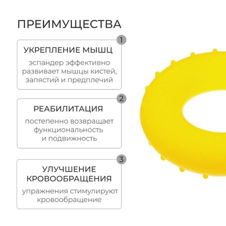 Эспандер кистевой ONLYTOP, массажный, 20 кг, цвет желтый. Кисти рук активно задействованы во многих видах физических упражнений, как на тренажерах, так и без таковых. Однако дополнительная тренировка кистей никогда не помешает, тем более что предназначенные для этой цели кистевые эспандеры хорошо развивают мышцы не только кистей рук, но и запястий. Помимо этого кистевые эспандеры легки и компактны, что позволит вам легко взять их с собой, положив в сумку или рюкзак, и поддерживать хорошую спортивную форму даже в путешествии. Как пользоваться кистевым эспандером: <ol> <li> Способ первый. Сжимаете-разжимаете эспандер до усталости руки (обычно 10-100 раз), затем даете «полный» отдых на протяжении 1-5 минут и снова подход. Необходимо выполнять от 3 до 10 подходов на каждую руку.</li> <li> Способ второй. Выполнять следует так же, как и в первом способе, только рука во время перерыва в подходах держит эспандер в сжатом положении. Количество подходов до 7. Если для вас эспандер слишком легкий следует приобрести новый более жесткий эспандер. </li> </ol>